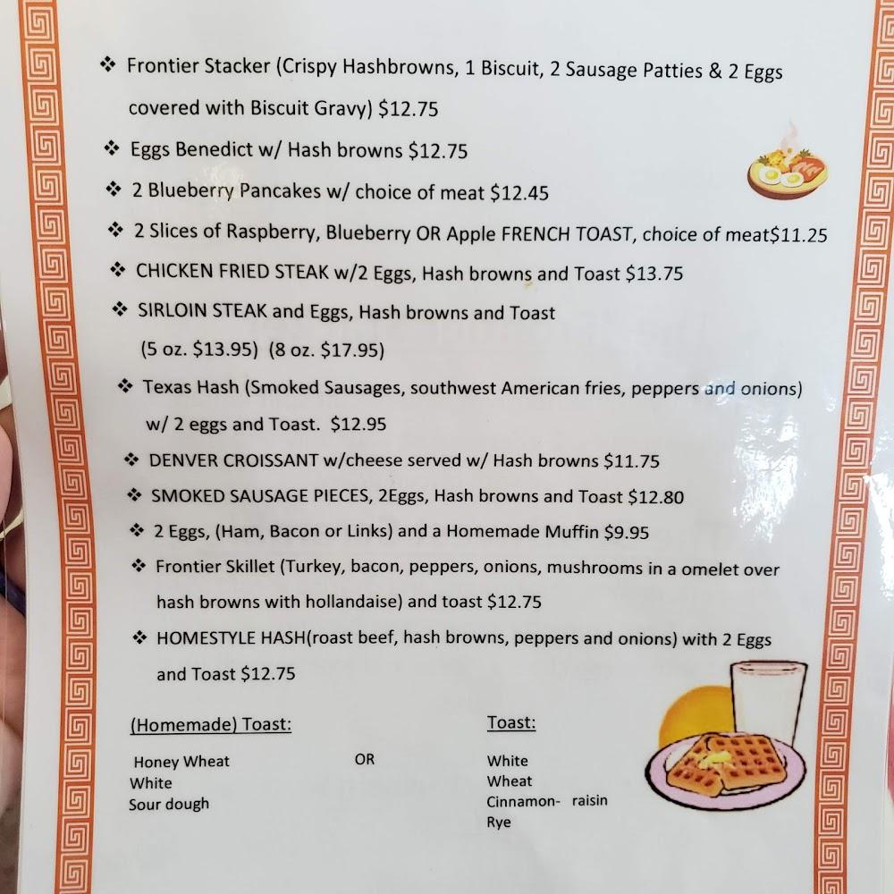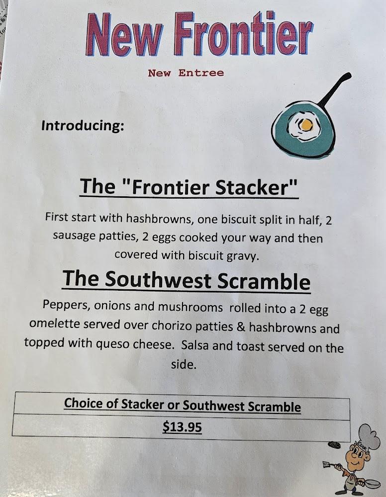 The menu at The New Frontier is a tribute to traditional American kitchen fare. Choices include breakfast classics like the Frontier Stacker and a hearty array of lunch dishes featuring local favorites, like meatloaf and turkey sandwiches.